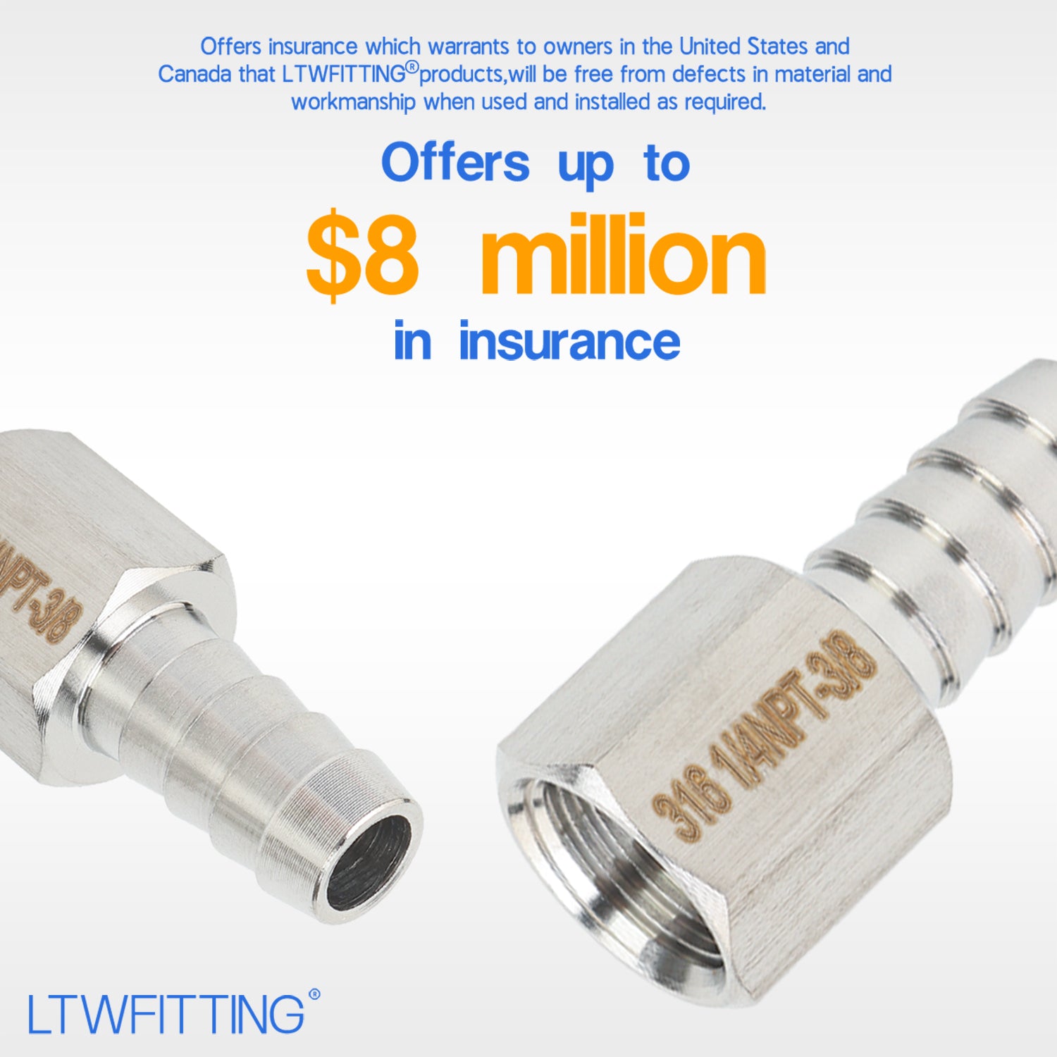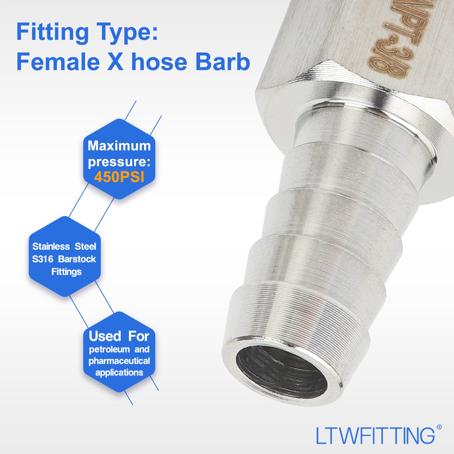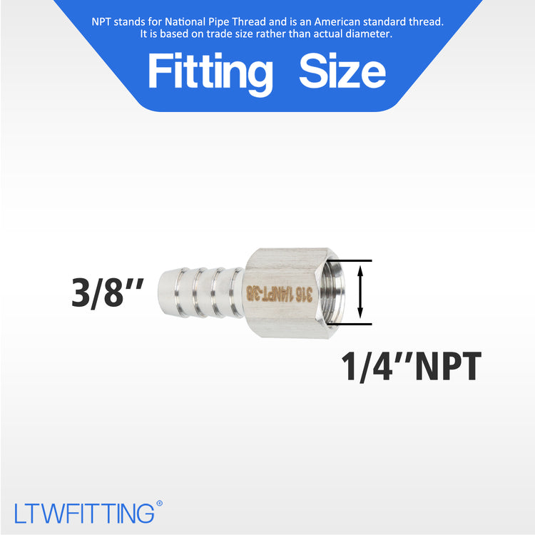 LTWFITTING Bar Production Stainless Steel 316 Barb Fitting Coupler 3/8 Inch Hose ID x 1/4 Inch Female NPT Air Fuel Water (Pack of 500)