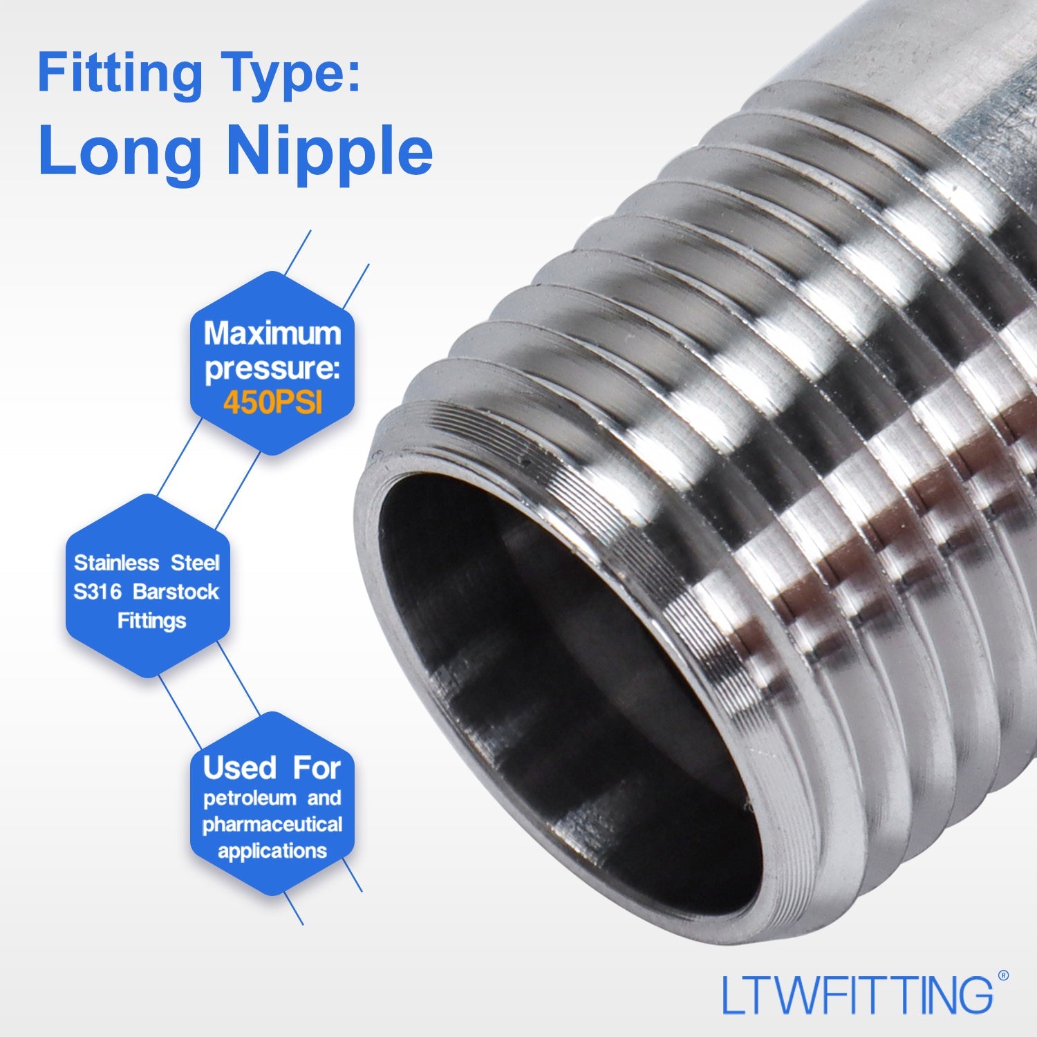 LTWFITTING Stainless Steel 316 Pipe 2-1/2 Inch Long Nipple Fitting 1/2 Inch Male NPT (Pack of 20)