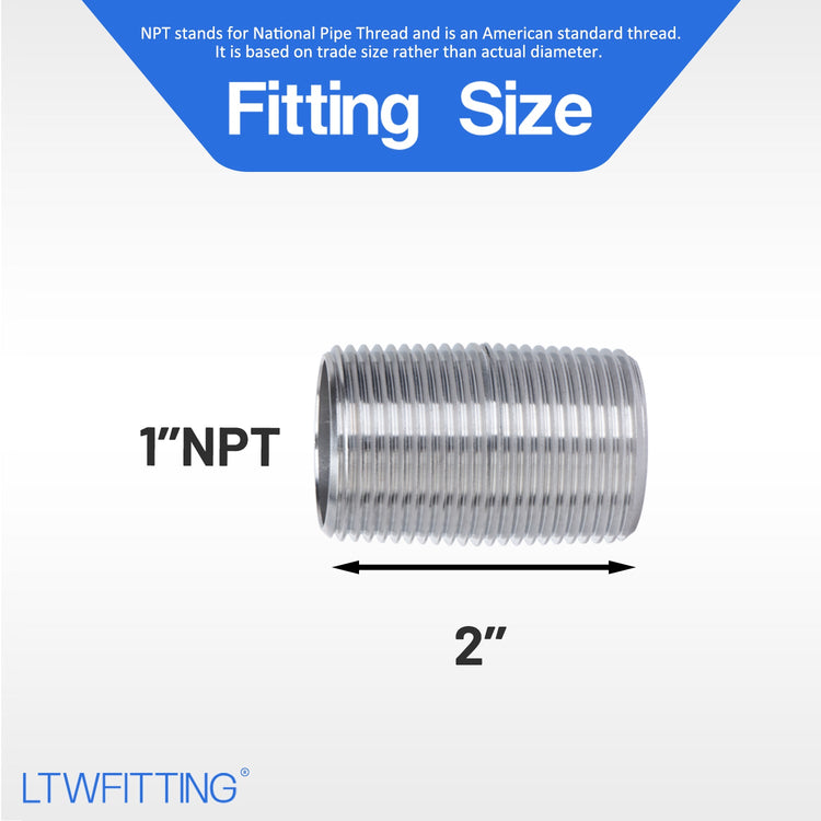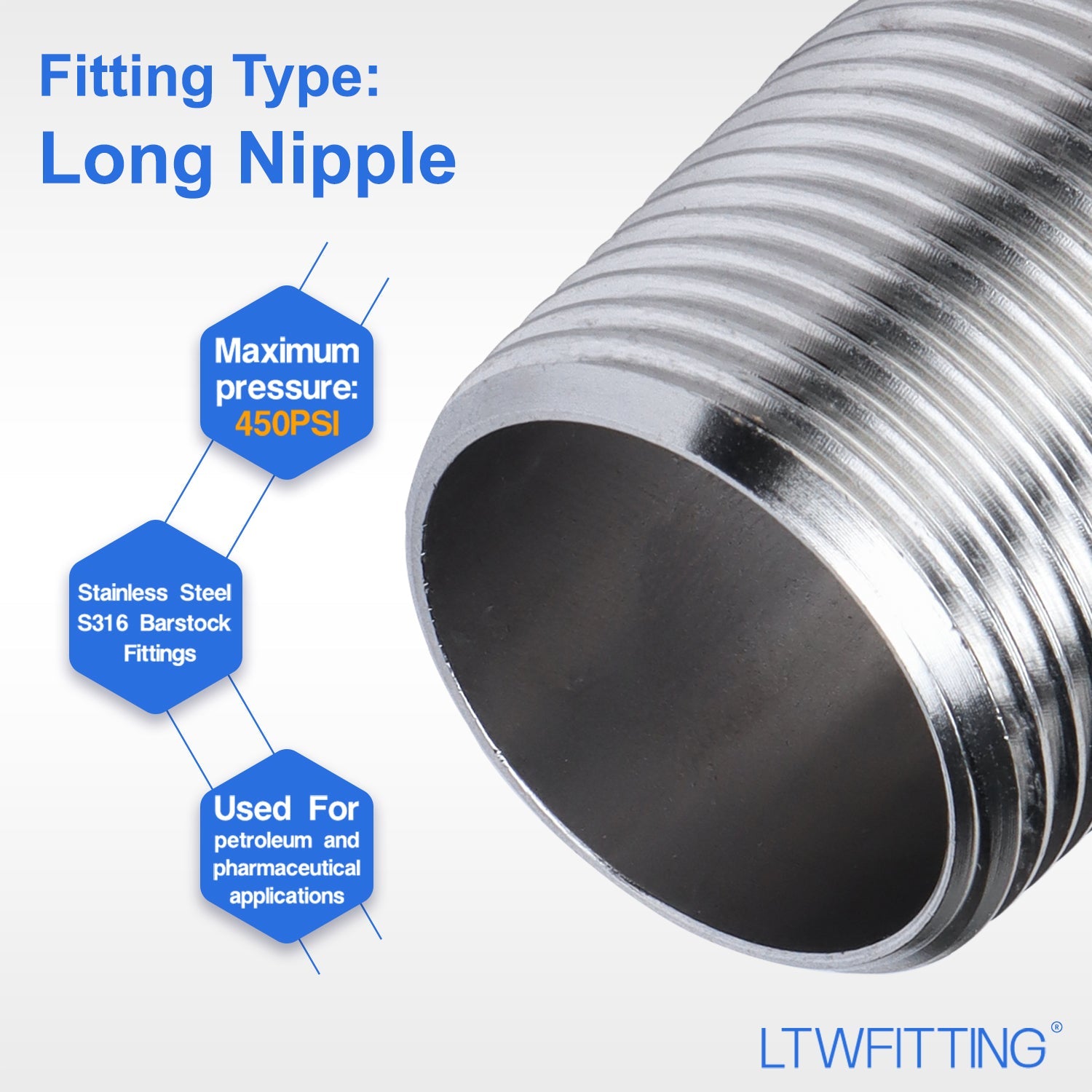 LTWFITTING Stainless Steel 316 Pipe 2 Inch Long Nipple Fitting 1 Inch Male NPT (Pack of 2)